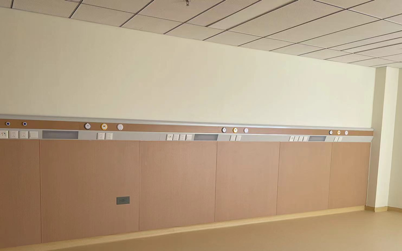 普通房間床頭安裝鋁合金設備帶,配有氧氣和吸引端口、電源插座及床頭照明設備。