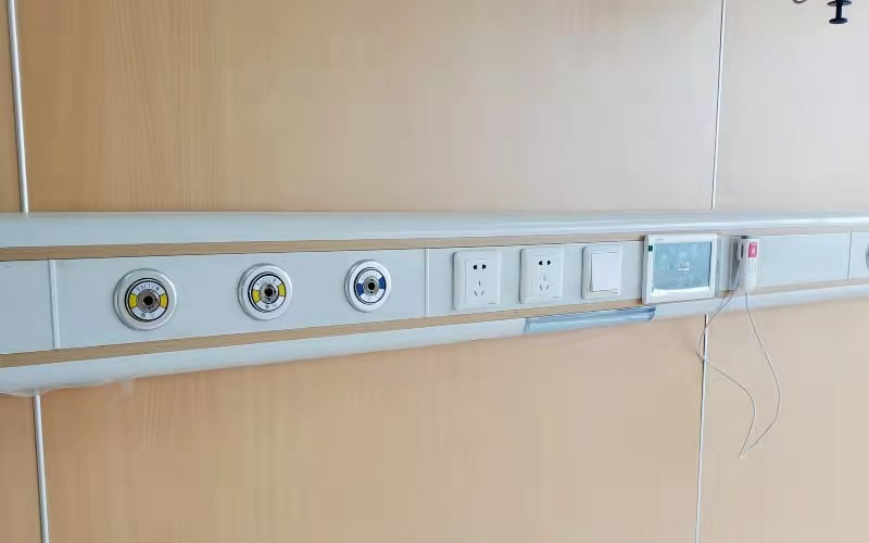 病房設(shè)備帶采用和裝飾墻板配色相近的杉木紋條和白色,每個床位安裝一個氧氣終端、兩個吸引終端、兩個電源插座、一個床頭燈和開關(guān)、一個7寸液晶顯示信息化呼叫器分機。