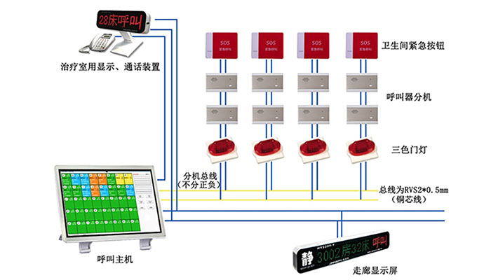 目前醫(yī)院呼叫對講系統(tǒng)大致分為兩類,一類是智能型醫(yī)護對講系統(tǒng),通過設(shè)立護士站主機、病區(qū)走廊顯示屏、病房分機、衛(wèi)生間緊急按鈕、病房門口門燈等設(shè)備可實現(xiàn)功能大致有護士站病房雙向呼叫,語音對講,衛(wèi)生間緊急呼叫,三色門燈分別不同顏色顯示區(qū)分衛(wèi)生間緊急呼叫或分機等級呼叫,護士站護理主機護理級別設(shè)置,走廊顯示屏呼叫信息顯示等常規(guī)基本護理功能。第二類為信息化網(wǎng)絡(luò)呼叫系統(tǒng),這種系統(tǒng)除涵蓋智能型功能的基礎(chǔ)上,可通過與醫(yī)院HIS系統(tǒng)連接實現(xiàn)病員信息查詢和更新記錄,病房安裝5-7寸液晶顯示分機,患者也可實時查詢相關(guān)治療和費用等信息。