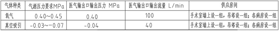 13、各種氣體氣源壓力要求、醫(yī)氣輸出口壓力、流量參數(shù)、醫(yī)氣輸出口種類及數(shù)量見下表:
