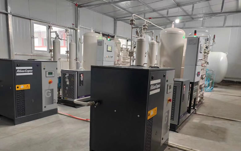 醫(yī)用制氧機(jī),使用空壓機(jī)收集環(huán)境空氣,通過分子篩選出氧氣儲(chǔ)存和供應(yīng),氧氣濃度約93%,輸送至管道的壓力大約0.5map.