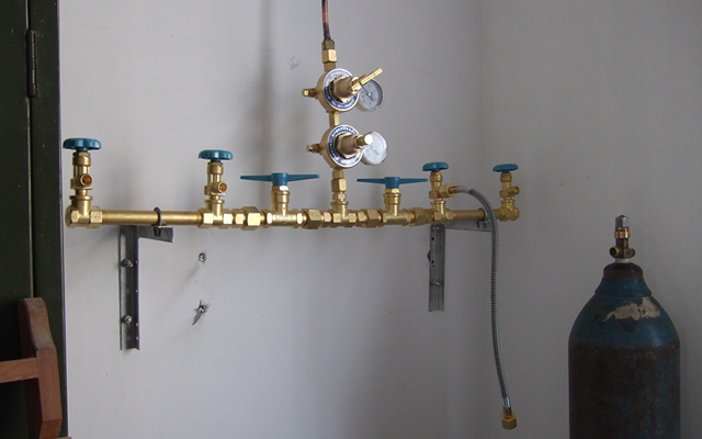 鄉(xiāng)鎮(zhèn)衛(wèi)生院中心供氧系統(tǒng)氧氣站房一般采用氧氣匯流排和中小型醫(yī)用制氧機的解決方案供應(yīng)氧氣,通過氧氣管道輸送到各個用氧點。充灌氧氣方便的地區(qū)可采用多個40L氧氣瓶通過氧氣匯流排連接減壓設(shè)備、穩(wěn)壓設(shè)備供氧,這種方案的優(yōu)點是前期投入低,氧氣濃度有保證(一般都能達(dá)到99%)。