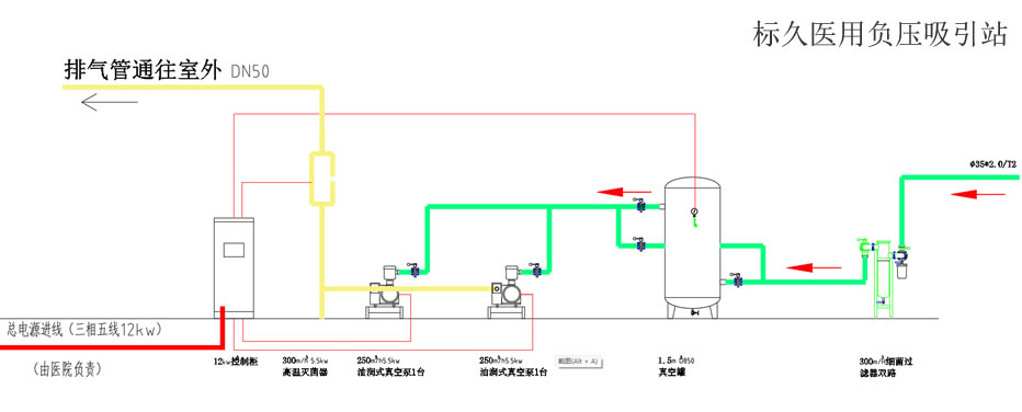 4、中心吸引站應(yīng)設(shè)置應(yīng)急備用電源并連接到站房配電箱,由院方負(fù)責(zé)。