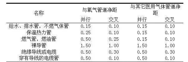 表2 架空醫(yī)用氣體管道與其他管道之間的最小間距(m)